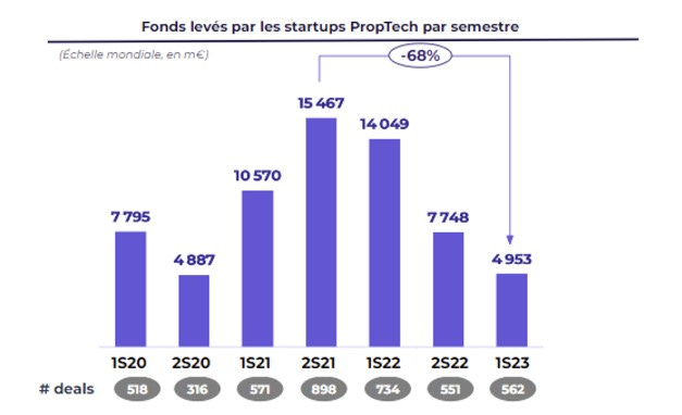L’investissement dans la PropTech à l’échelle mondiale enregistre sa troisième baisse consécutive depuis son pic enregistré au 2S 21 avec 4,95Mds$ d’investissements, soit une baisse de 68% au 1S 23 par rapport au 2S 21.