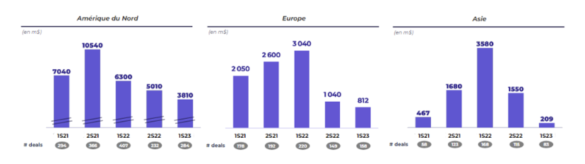 En Europe, les investissements ont fortement chuté au 2S 22, et ont continué à plonger de façon moins raide jusqu’au 1S 23.
