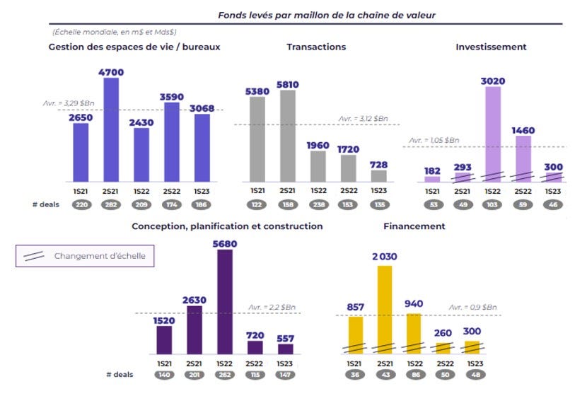 L’environnement macroéconomique a eu un impact contrasté sur les différents segments de la chaîne de valeur de la PropTech, certains secteurs ont subi une chute de l’investissement de plein fouet, tandis que d’autres ont relativement fait preuve de résilience :